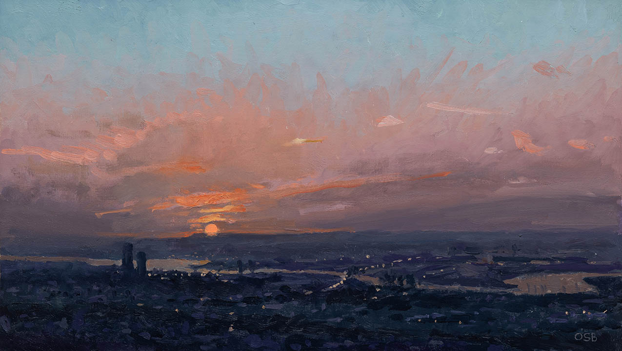 Sunset over NJ - Oil on canvas panel, 16" x 9.1", May 2022