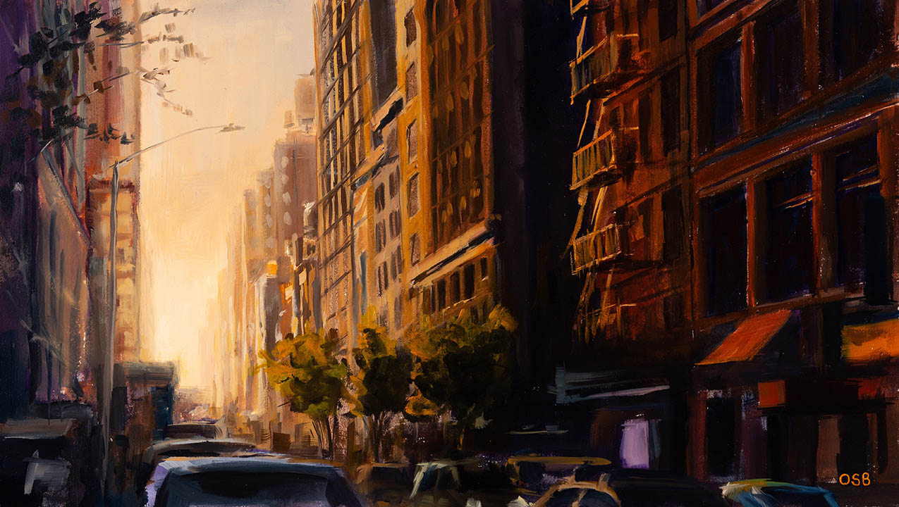 Sunrise on 35th Street - Oil on canvas, 24" x 30", July 2020