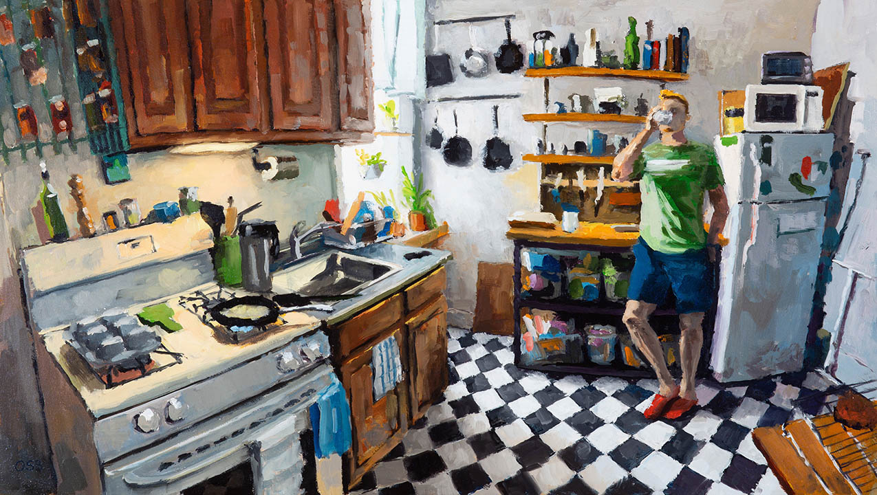 Interior #4 (Blake in his kitchen) - Oil on panel, 16" x 9.1", July 2020